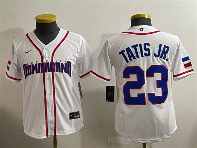 Home>MLB>2026 World Baseball>Dominican Republic>Women Dominican Republic Baseball Fernando Tatis Jr White 2026 World Baseball Classic Home Stadium Stitched Baseball Jersey Run Small