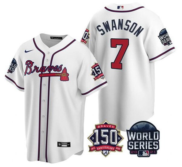 Home>MLB>2021 World Series >Atlanta Braves>Men Atlanta Braves 7 Dansby Swanson 2021 White World Series With 150th Anniversary Patch Cool Base Stitched Jersey