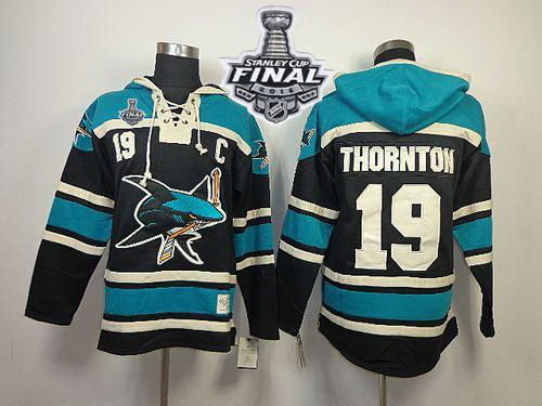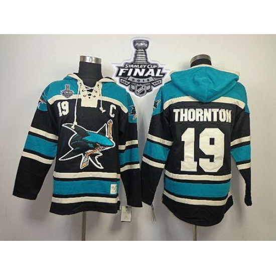 - Men San Jose Sharks 19 Joe Thornton Black Sawyer Hooded Sweatshirt Stitched NHL Jersey
