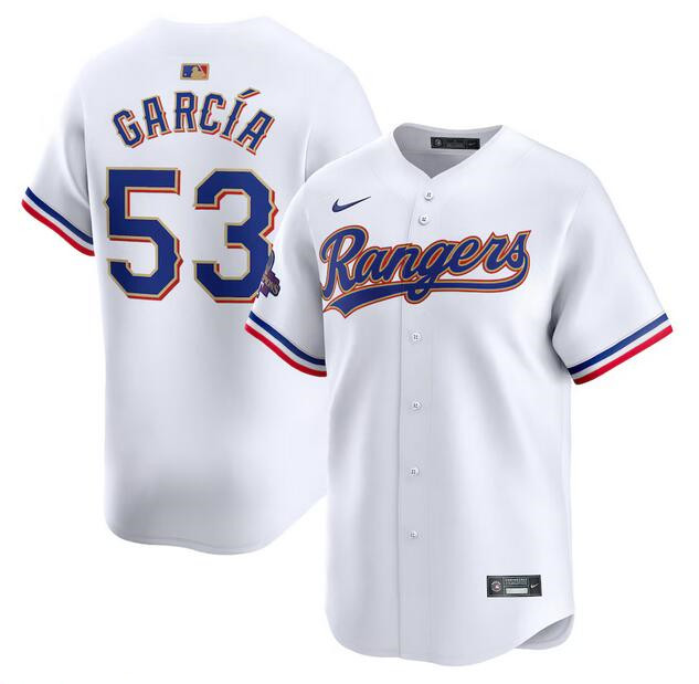 - Men Texas Rangers 53 Adolis Garc EDa White Gold Cool Base Stitched Baseball Jersey