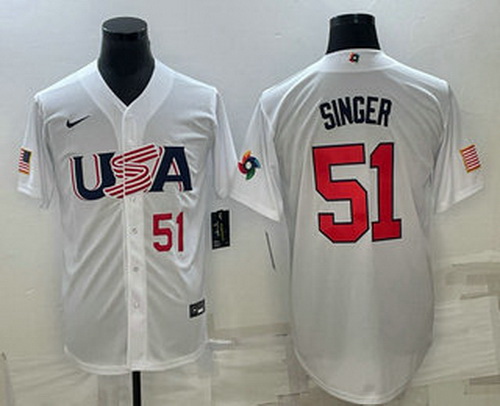 - Mens USA Baseball #51 Brady Singer Number 2023 White World Baseball Classic Stitched Jersey