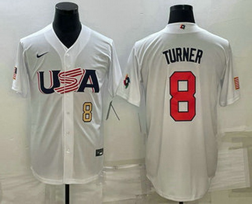 - Men's USA Baseball #8 Trea Turner 2023 White World Baseball Classic Stitched Jersey