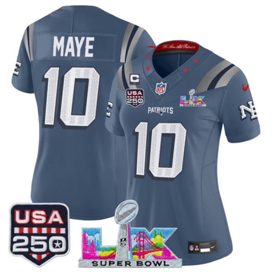Women New England Patriots 10 Drake Maye Storm Blue 2025 F U S E 1 Star C Patch And Super Bowl LX Patch USA 250 Patch Rivalries Vapor Limited Football Sti